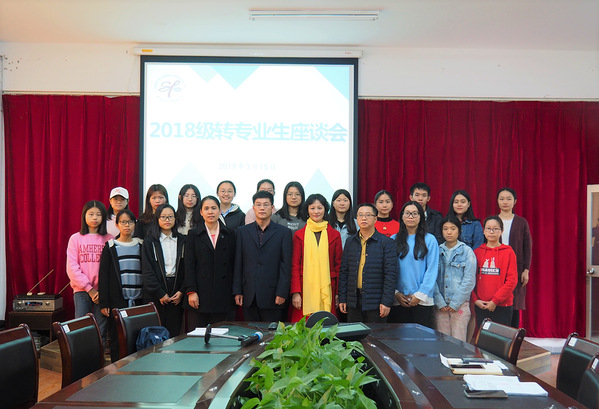 【本网讯】2019年3月15日下午,为使转入学生尽快适应新专业学习,外国语学院在会议室举行了2018级转专业生座谈会。外国语学院党总支书记张小琨、副书记邓育明、副院长易斌,辅导员江佳芬老师、教务员李小芳老师及2018级15名转入学生参加了座谈。