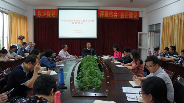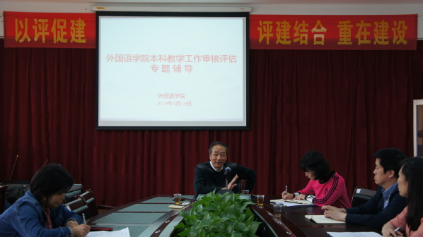 潘教授对我院积极做好迎接评估的准备工作给予充分肯定,并就进一步做好迎评工作提出几点意见:一是要牢记学校和学院的办学定位、培养目标,与审核评估相关的基本知识;二是要熟记学院英语(师范)、商务英语和日语三个专业的培养目标,专业就业方向和就业反馈情况;三是强调各专任教师要理解清楚各自所授课程对学生的培养作用;四是要深刻把握审核评估重点的“五个度”的要求,即“适应度、保障度、有效度、满意度以及达成度”。