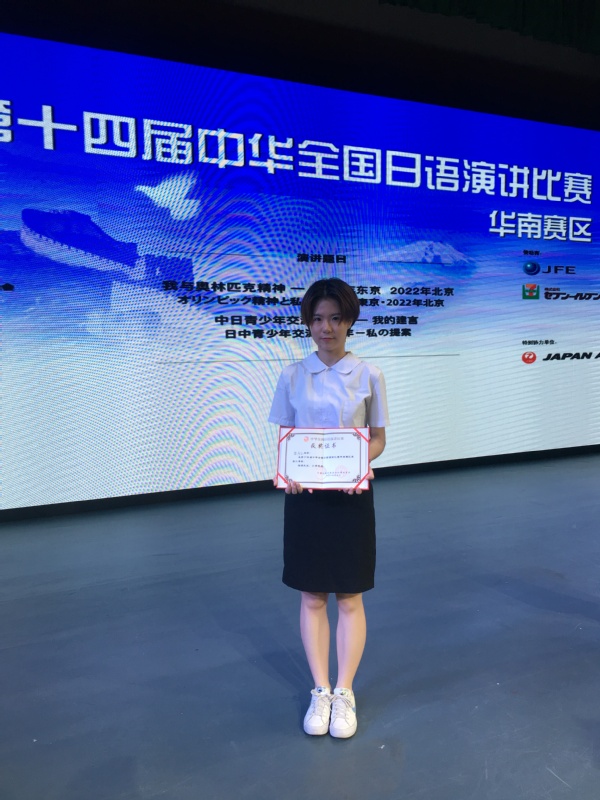【本网讯】 5月26日,第十四届中华全国日语演讲比赛华南赛区预赛在广东外语外贸大学举行。此次活动被列为2019年中日青少年交流促进年活动,汇集了来自广东、福建、广西和海南4个省份30所知名高校的30名优秀选手,我院日语专业16级日语2班黎彦谷同学经过层层选拔,有幸与华南地区知名高校选手同台竞技。她的日语语音语调准确,语言表达流畅富有激情;善于用神情动作展示所表达的思想和感情;形象优雅、大方,而且在演讲中表达了一个日语专业学生,为促进中日青少年交流的具体行动和努力。最终排名第7名获得三等奖,在同类院校中获得最好成绩,实现了我校在该项比赛上的历史性突破。