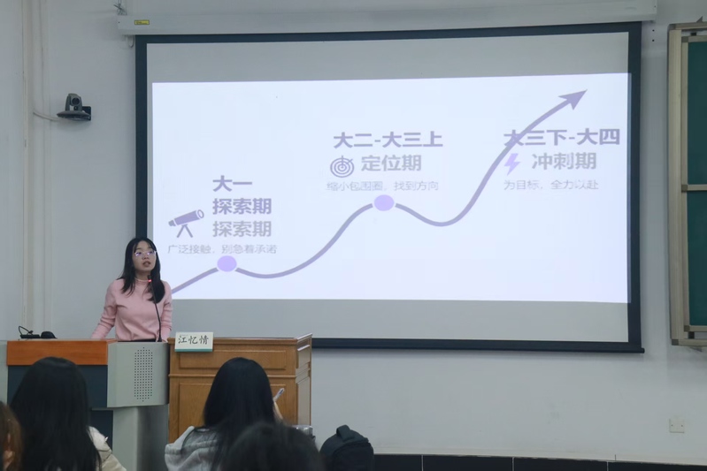 分享会上,江忆情校友结合自身从惠州学院本科考入广州大学硕士研究生,并成功考取惠州市直学校的亲身经历,以“以终为始——以简历为导向的逆向大学生涯规划”为主题,为新生带来了一场内容丰富、逻辑清晰的生涯指导课。她首先强调了目标导向的重要性,鼓励大家从设想一份理想的毕业简历开始,反向规划大学四年的学习路径与实践安排。随后,她从“专业学习”、“证书考取”、“技能拓展”、“社会实践”及“考研备战”等多个维度,详细剖析了如何有步骤、有重点地充实大学生活,打造个人核心竞争力。江忆情校友的分享语言平实、案例生动,极具参考价值和可操作性,为正处于迷茫与探索期的大一新生提供了清晰的行动指南。