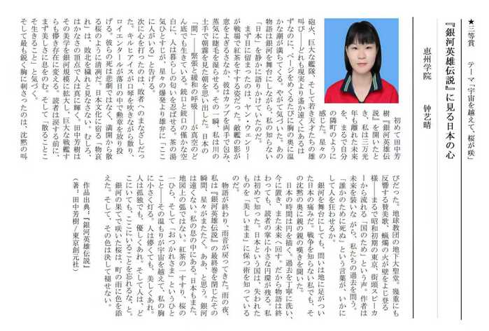 在获奖作品中,钟艺晴同学以日本作家田中芳树的经典科幻小说《银河英雄传说》为切入点,透过浩瀚星河中的英雄叙事,细腻解读了蕴含其中的日本文化精神。她从人物在战火中品茗红茶的“间”(停顿与呼吸)、对待败者的“物哀”美学,以及历史反思中的沉默呐喊等多个层面,剖析了文学如何跨越时空,传递出一个民族对生命、美与历史的深刻思考。文章笔触优美,见解独到,展现了我校学子深厚的人文素养、跨文化理解力与扎实的日语表达能力。