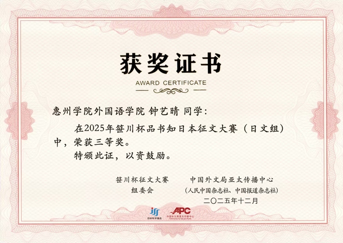 “笹川杯品书知日本征文大赛”作为中日人文交流的重要品牌活动,旨在鼓励中国青年通过阅读日本书籍,增进对日本社会与文化的客观理解。此次获奖,不仅是我校学子在国际性专业赛事中的一次精彩亮相,也体现了外国语学院在人才培养中,注重语言技能与人文思想并重、课堂教学与跨文化实践结合所取得的积极成效。