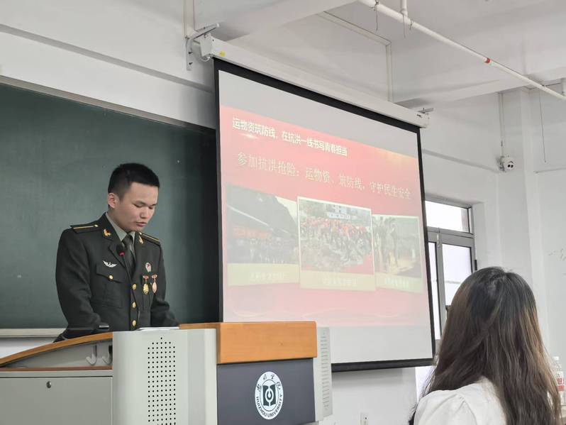 会上,武装部宣讲团围绕大学生征兵核心要点展开全面讲解。主讲人陈宗俊以2020年戍边英雄“清澈的爱,只为中国”的赤诚事迹,生动展现了军人以生命守护山河的担当精神,令在场学子深受感动与鼓舞。他结合自身军旅经历,分享了在抗洪抢险、应急救援等任务中“以血肉之躯筑堤坝,用军民鱼水暖人间”的感人故事,鼓励同学们珍惜青春年华,将个人理想融入国防事业,在军营中锤炼意志、增长才干,实现青春价值。