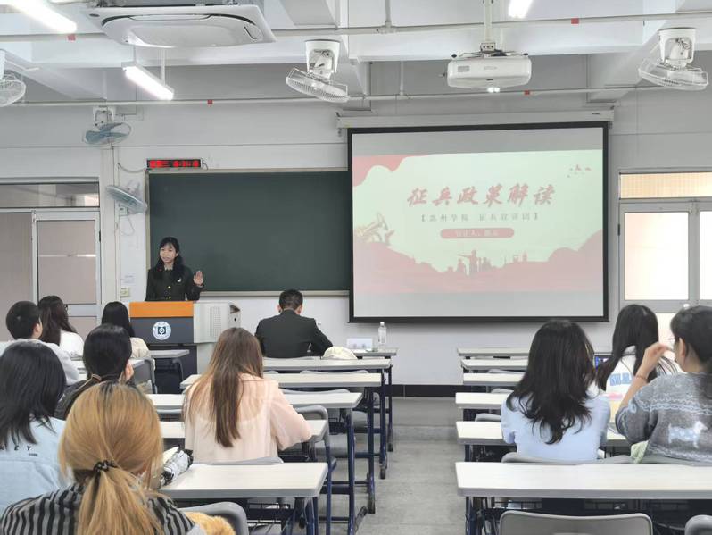 近期,为深入贯彻落实国家征兵工作部署,强化青年学生国防观念与报国担当,惠州学院外国语学院2026年征兵宣讲会在旭日楼509教室顺利举行。校武装部宣讲团成员陈乐、陈宗俊,学院青志联工作人员及报名参与宣讲会的学生共同参加了本次活动。